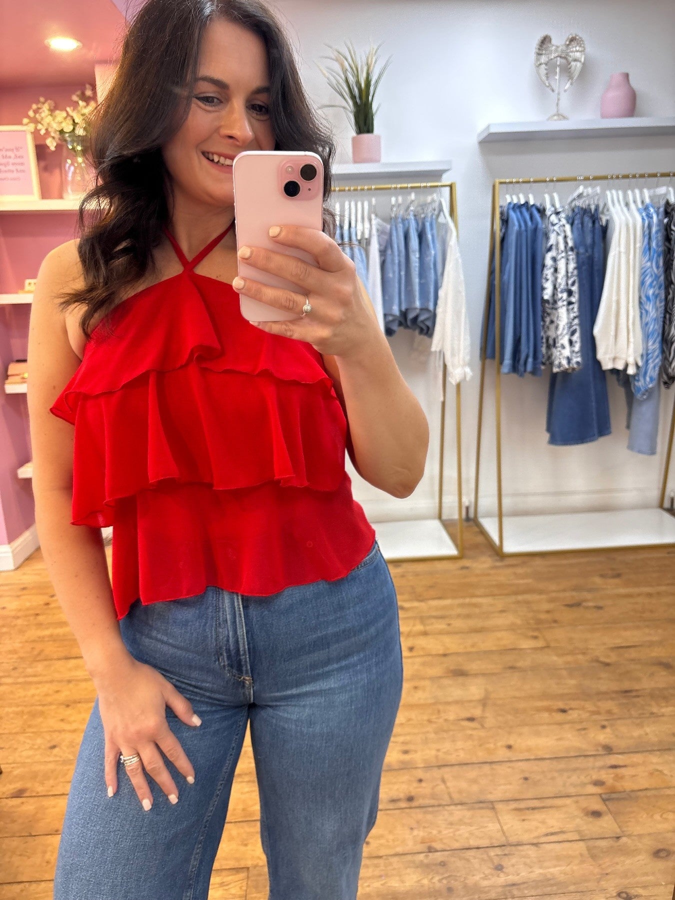 Back tie to the back of the top or it can be worn hanging down as a alternative look